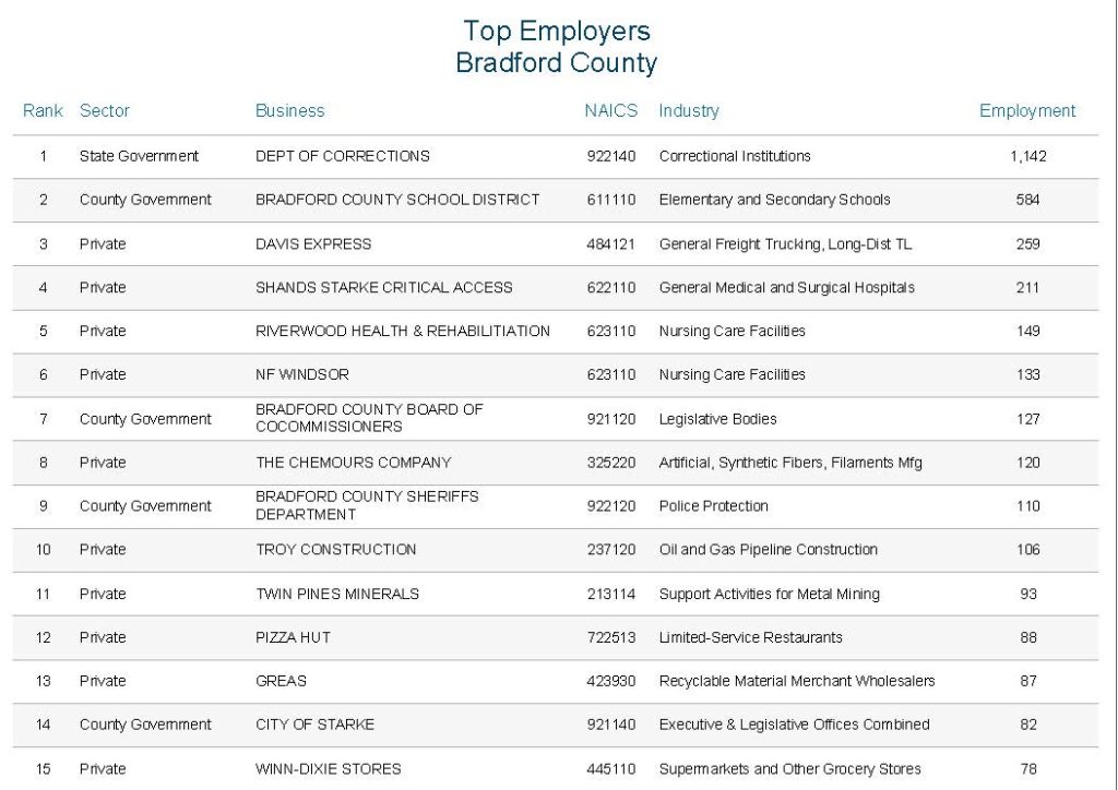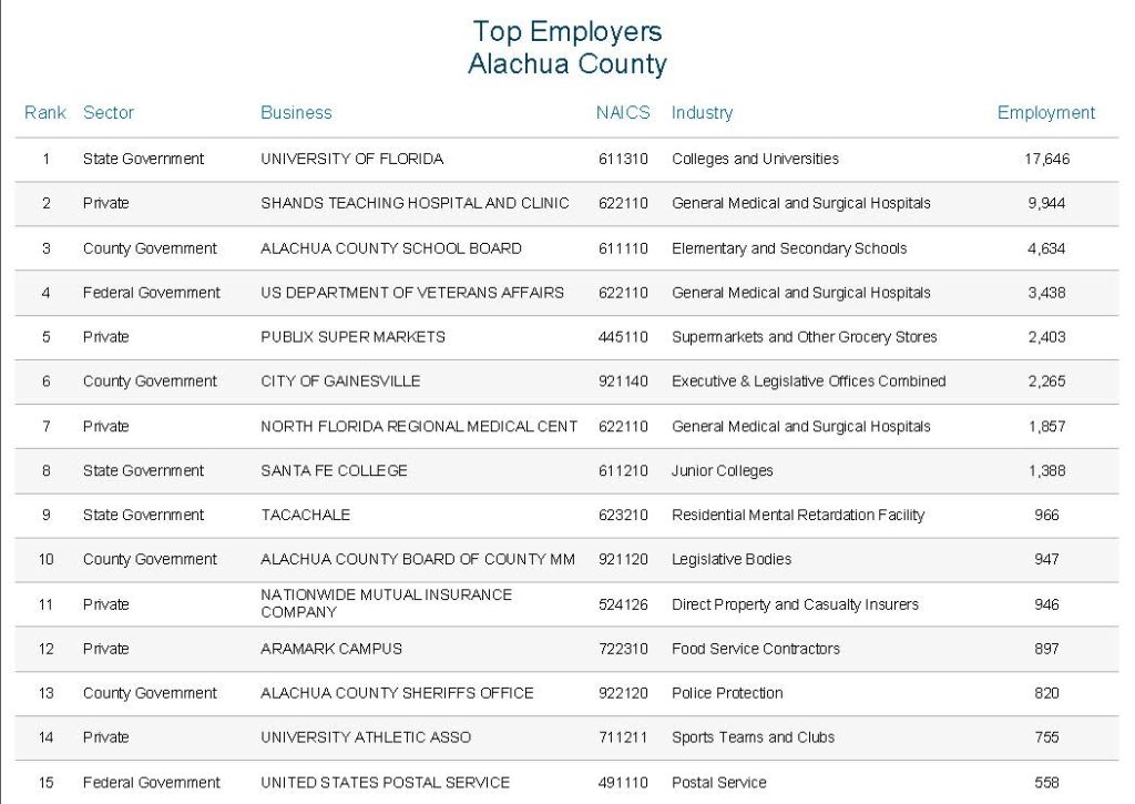 Below are the top 15 employers in Alachua and Bradford Counties.
