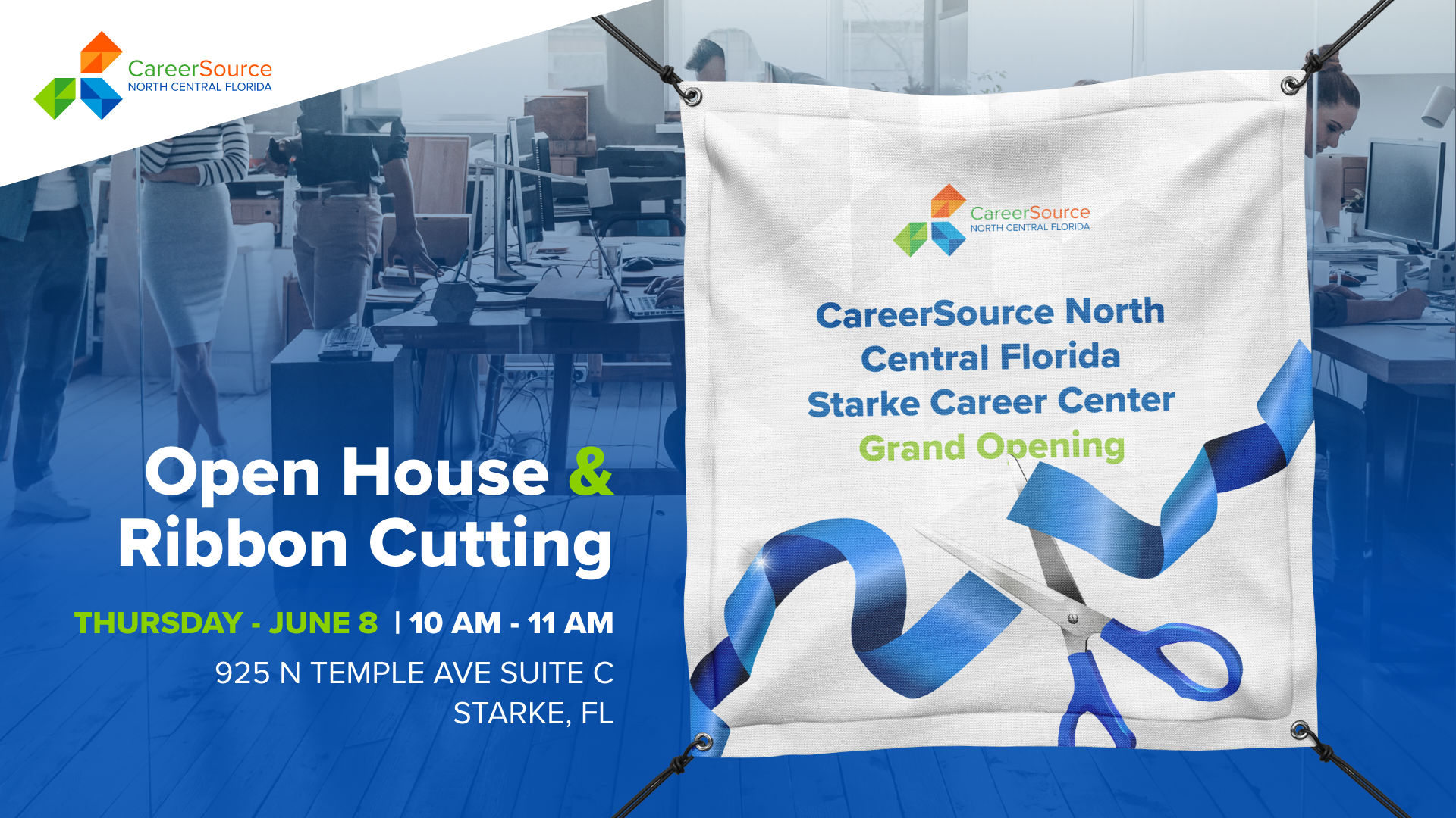 CareerSource North Central Florida (CSNCFL) is hosting a grand opening and ribbon cutting for the new Starke Career Center on June 8, 2023, from 10 AM to 11 AM. This event will occur at 925 North Temple Ave., Suite C., 32091 Starke, FL, and is open to the public. Get a sneak peek at our new center and discover the exciting job opportunities available for local seekers and valuable resources for employers. We’re looking forward to seeing you there!