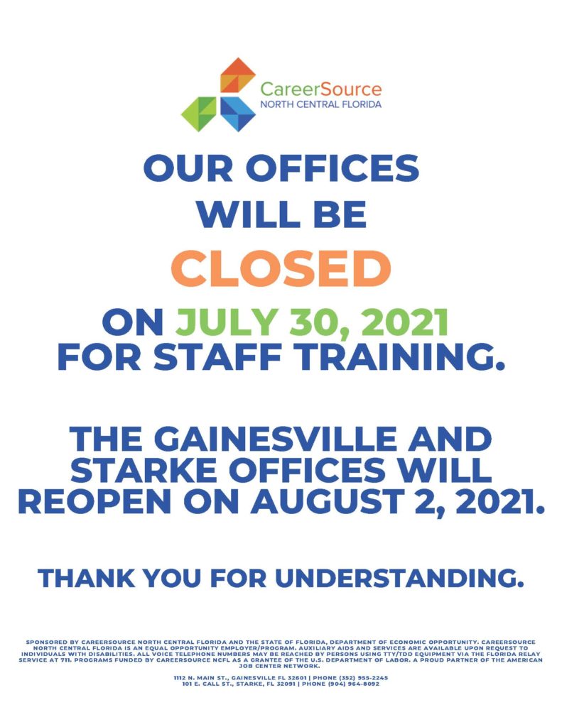 OFFICE CLOSURE: July 30, 2021 for Staff Training