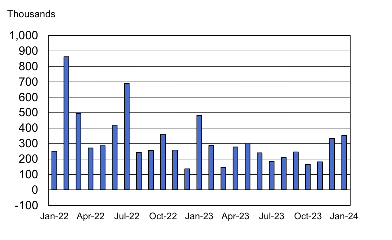 Nonfarm payroll employment over-the-month change, seasonally adjusted, January 2022 – January 2024.